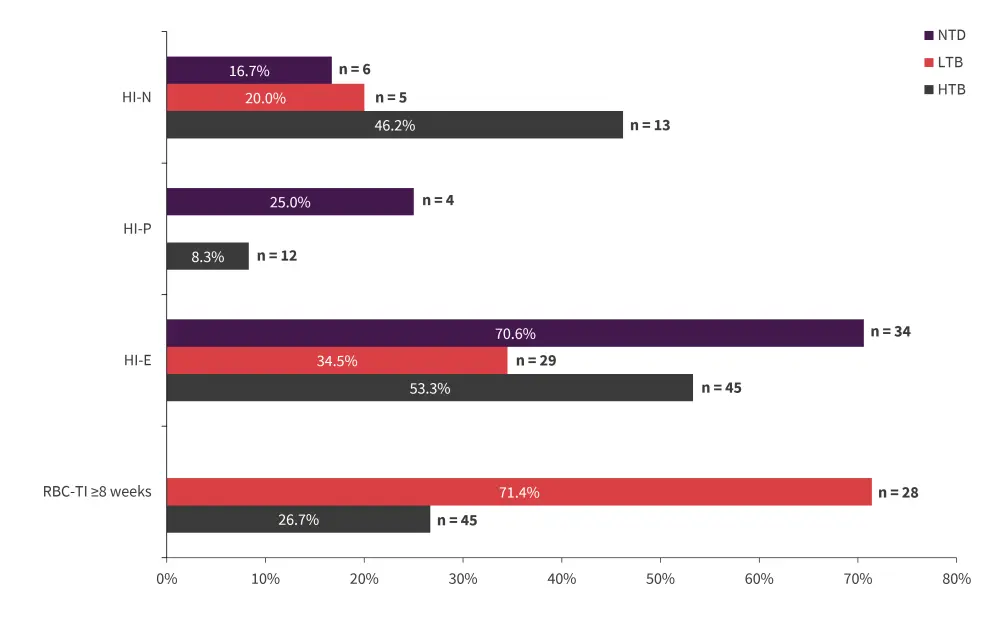 HI-E, hematologic improvement erythroid; HI-N, HI neutrophil; HI-P, HI platelet; HTB, high transfusion burden; LTB, low transfusion burden; NTD, non-transfusion dependent; RBC-TI, red blood cell transfusion independence.