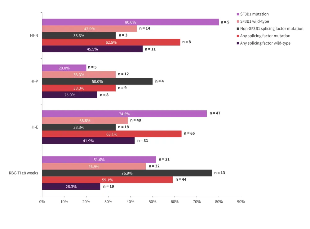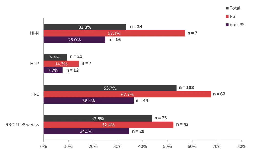 HI-E, hematologic improvement erythroid; HI-N, HI neutrophil; HI-P, HI platelet; RBC-TI, red blood cell transfusion independence.