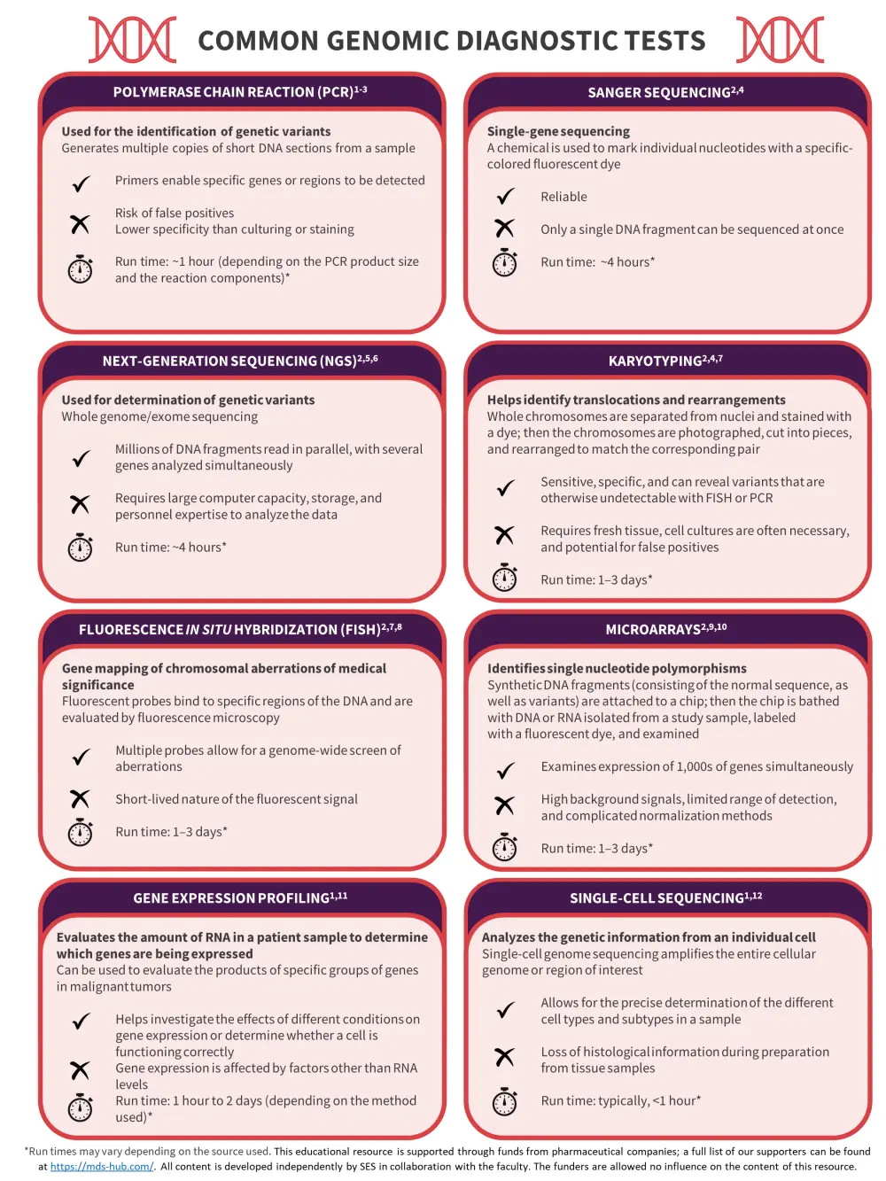 In view of this, the MDS Hub is proud to present a visual summary of the genomic diagnostic techniques commonly used in clinical practice. We outline the use of each technique, as well as their associated advantages and disadvantages.
