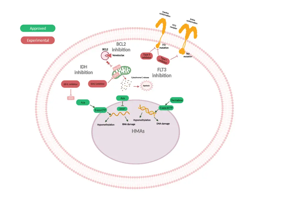 5-aza-CTP, 5-aza-2'-cytidine triphosphate; 5-aza-dCTP, 5-aza-2'-deoxycytidine triphosphate; Aza, azacitidine; BCL2, B-cell lymphoma 2; FLT3, Fms-related receptor tyrosine kinase 3; HMAs, hypomethylating agents; IDH, isocitrate dehydrogenase; TKD, tyrosine kinase domain.