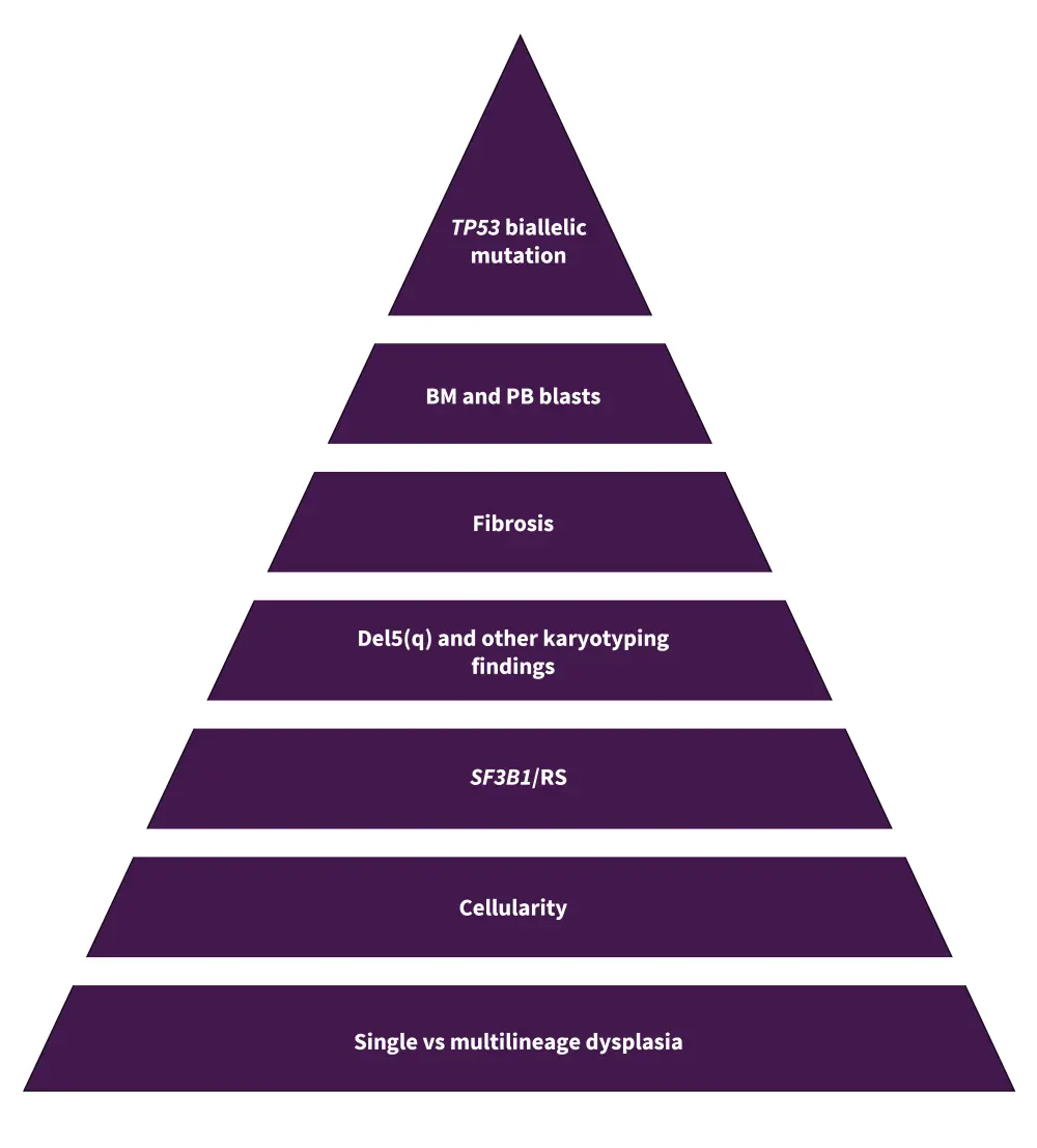 The 5th edition WHO classification separates morphologically and genetically defined MDS subtypes and omits MDS-unclassified subtypes. Figure 1 shows the 5th edition WHO classification hierarchy of diagnostic findings. The ICC includes new semantics and subtype refinement.