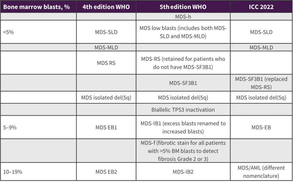 AML, acute myeloid leukemia; EB, excess blast; IB, increased blast; ICC, International Consensus Classification; MDS, myelodysplastic syndrome; MDS-f, MDS with fibrosis; MDS-h, MDS, hypoplastic MDS-SLD, MDS-single lineage dysplasia; MDS-MLD, MDS-multi-lineage dysplasia; MDS-RS, MDS-ring sideroblast; WHO, World Health Organization.