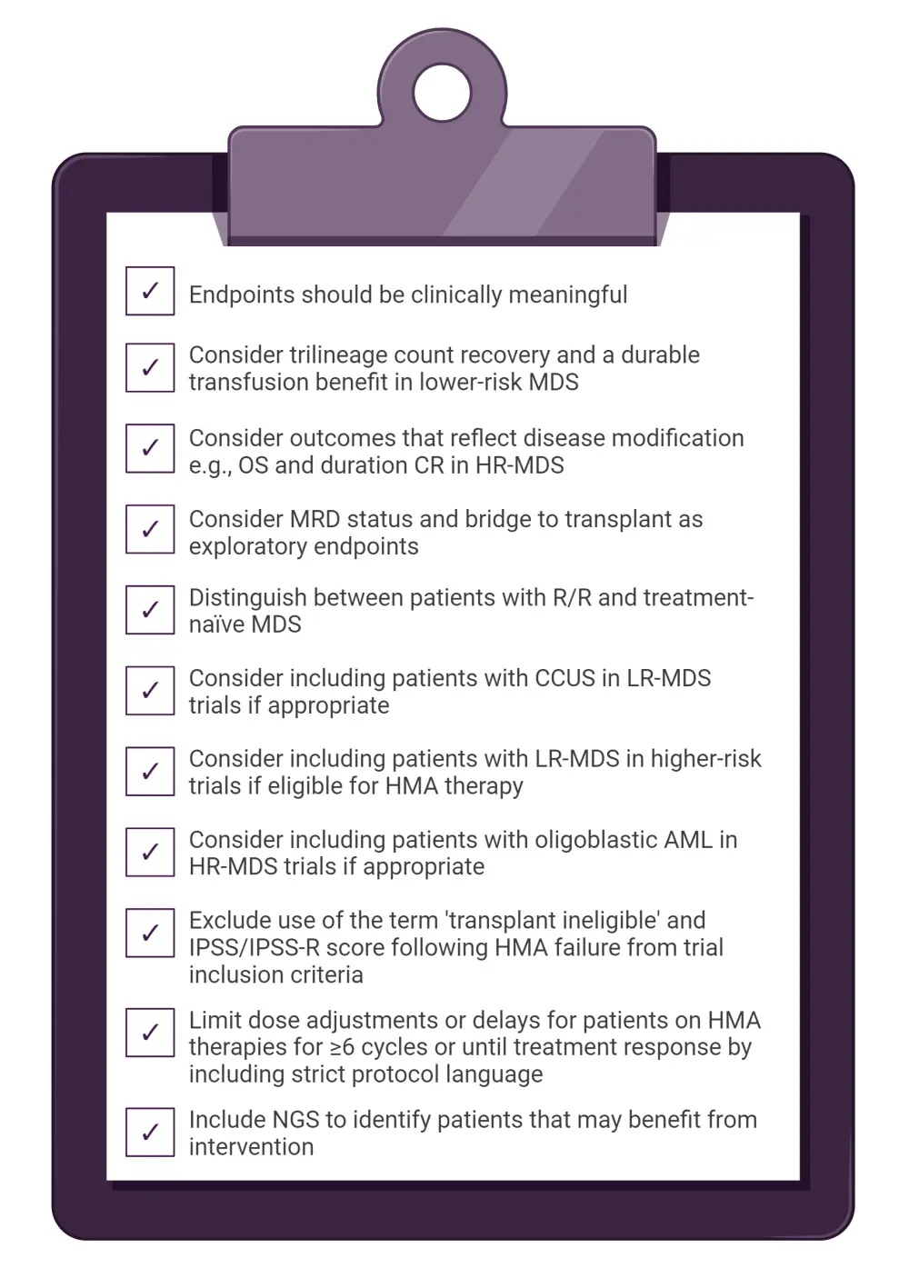 Sekeres et al.1 recently published expert recommendations for improving clinical trial design and endpoints to facilitate the development of novel therapies in MDS in Clinical Cancer Research. The MDS Hub is pleased to summarize the recommendations below.