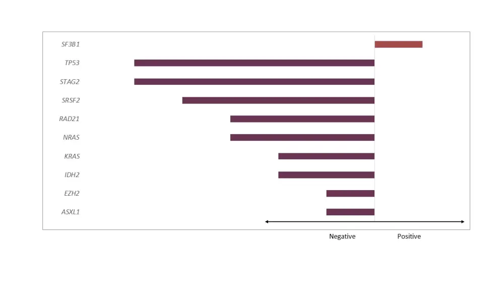 The median age of patients in the training and validation cohort was 71 years (range, 19−99) and 70 years (range, 20−92), respectively. Cytogenetic risk categories per IPSS-R included (4% vs 3%) with very good, (72% vs 58%) with good, (13% vs 15%) with intermediate, (4% vs 7%) with poor, and (6% vs 17%) with very poor risk in training and validation cohort, respectively. The clinical and mutational characteristics of both cohorts are summarized in Table 1.