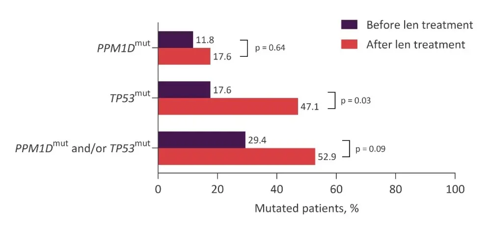 Only one of the five patients achieving a complete response had mutations before treatment, in PPM1D and ASXL1. The variant allele frequency (VAF) decreased after 76 months of lenalidomide treatment from 27.6% to 4.8% for PPM1D and 12.1% to 1.1% for ASXL1.
