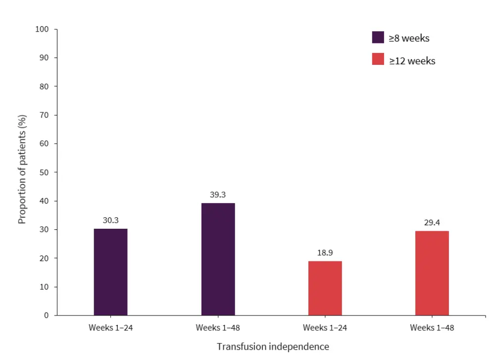 The primary endpoint was TI for ≥8 weeks during Weeks 1−24 of luspatercept treatment. Key secondary endpoints were TI for ≥12 weeks during Weeks 1−24 and 1−48 of luspatercept treatment.