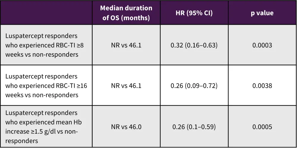 CI, confidence interval; Hb, hemoglobin; HR, hazard ratio; NR, not reached; OS, overall survival; RBC-TI, red blood cell transfusion-independence.