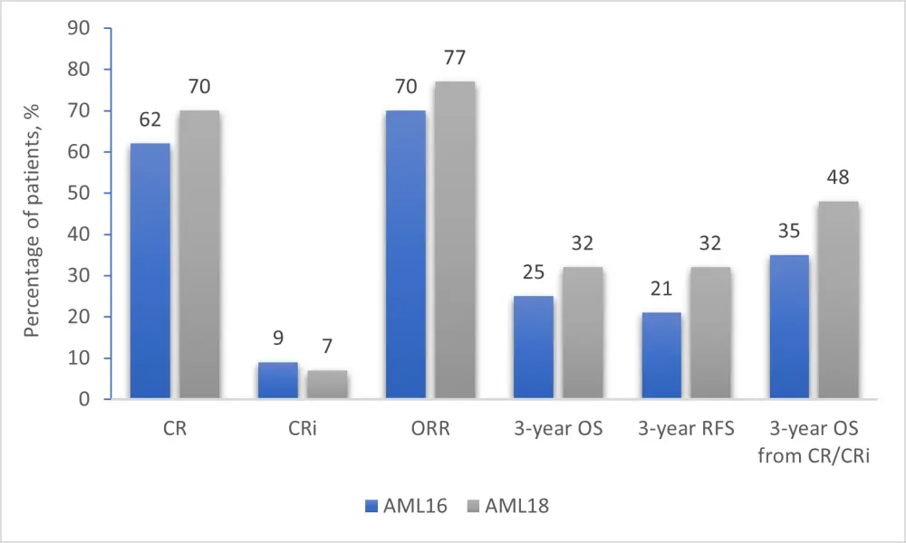 AML, acute myeloid leukemia; CR, complete remission; CRi, CR with incomplete hematological recovery; ORR, overall response rate; OS, overall survival, RFS, relapse-free survival.