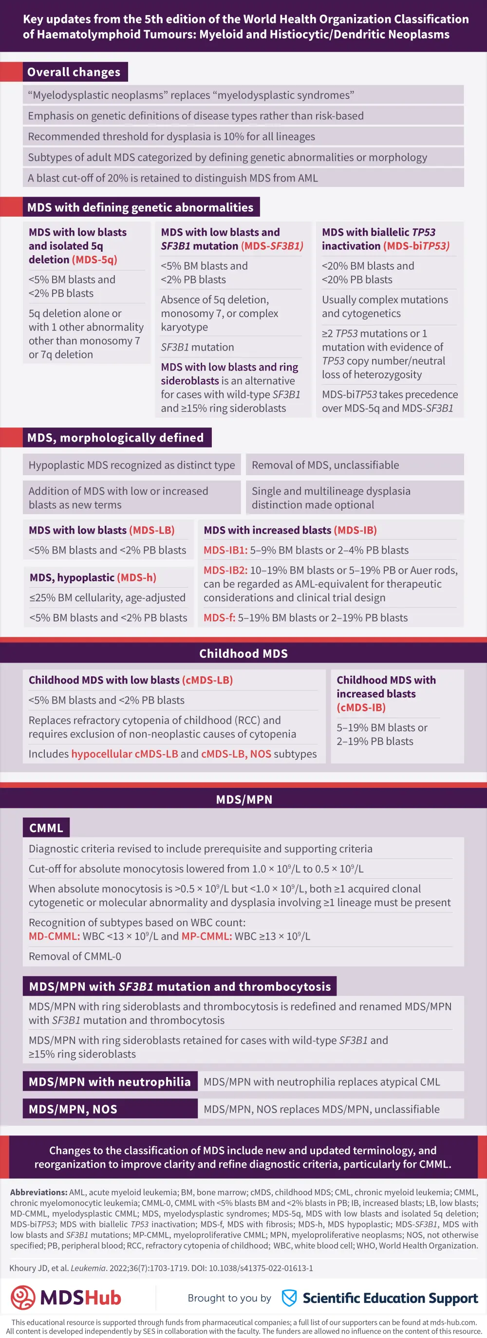The MDS Hub is pleased to present a visual abstract summarizing the key updates and changes in the 5th edition of the World Health Organization Classification of Haematolymphoid Tumours: Myeloid and Histiocytic/Dendritic Neoplasms. Updates include the grouping of myelodysplastic syndromes (MDS) entities as genetically or morphologically defined and the addition of MDS-SF3B1, MDS-5q, and MDS-biTP53 as genetically defined subtypes. Terminology describing the types of childhood MDS have been revised and the diagnostic criteria for chronic myelomonocytic leukemia have been amended.