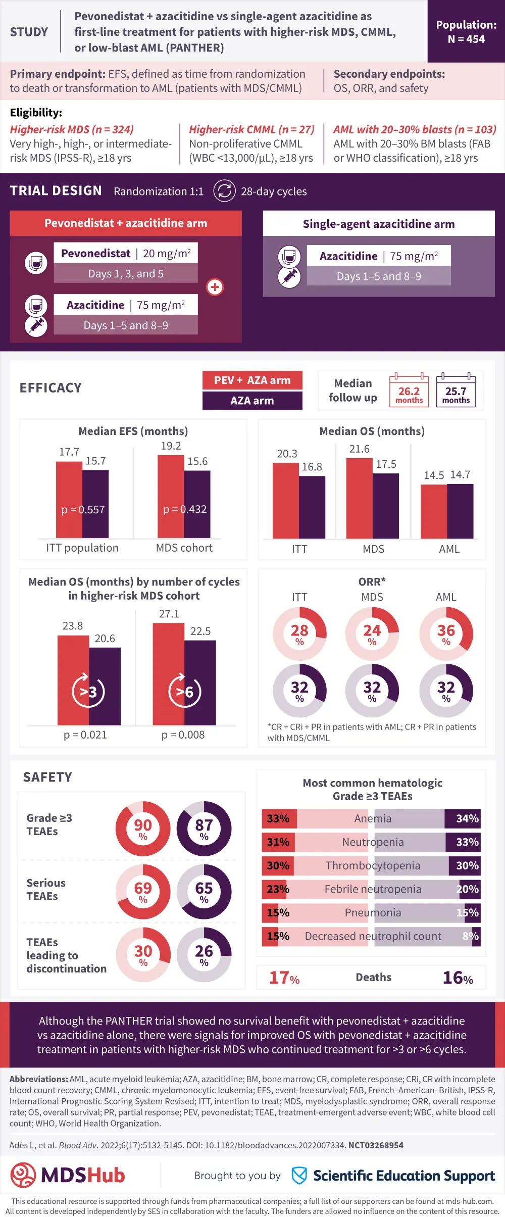 The MDS Hub is happy to present a visual abstract representing key findings from the phase III PANTHER trial (NCT03268954) evaluating the efficacy and safety of pevonedistat + azacitidine vs azacitidine alone in patients with higher-risk myelodysplastic syndromes and low-blast-percentage acute myeloid leukemia.