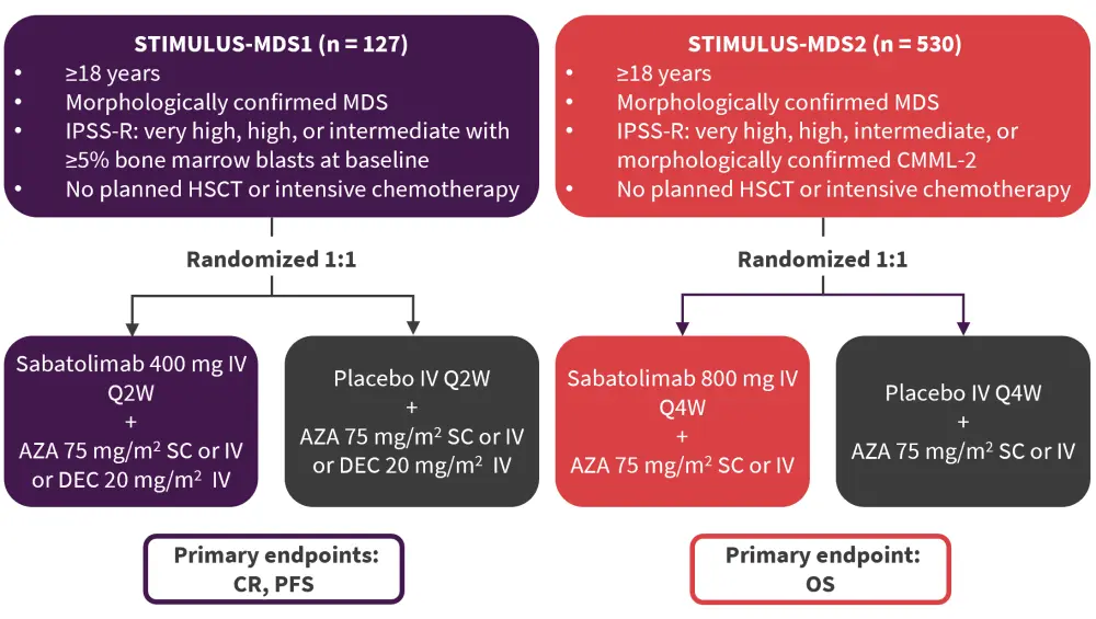 This analysis compared IPSS, IPSS-R, and IPSS-M scoring systems within the overall patient population from the phase II STIMULUS-MDS1 (NCT03946670) and phase III STIMULUS-MDS2 (NCT04266301) clinical trials, which have been previously covered by the MDS Hub. These trials investigated sabatolimab and HMA in patients with higher-risk MDS (Figure 1).